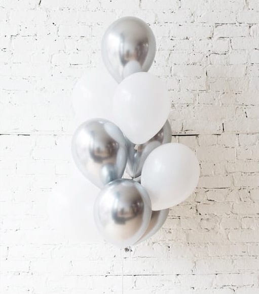 - 5 balonów białych i 5 balonów srebrnych chrome na srebrnych wstążkach