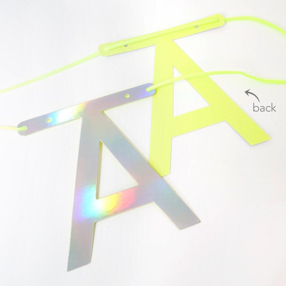 Zestaw srebrnych, lekko holograficznych liter i znaków do ułożenia dowolnego napisu. Zestaw zawiera 134 litery, cyfry i znaki oraz 50 klipsów. Wymiary: maksymalna długość 366 centymetrów.