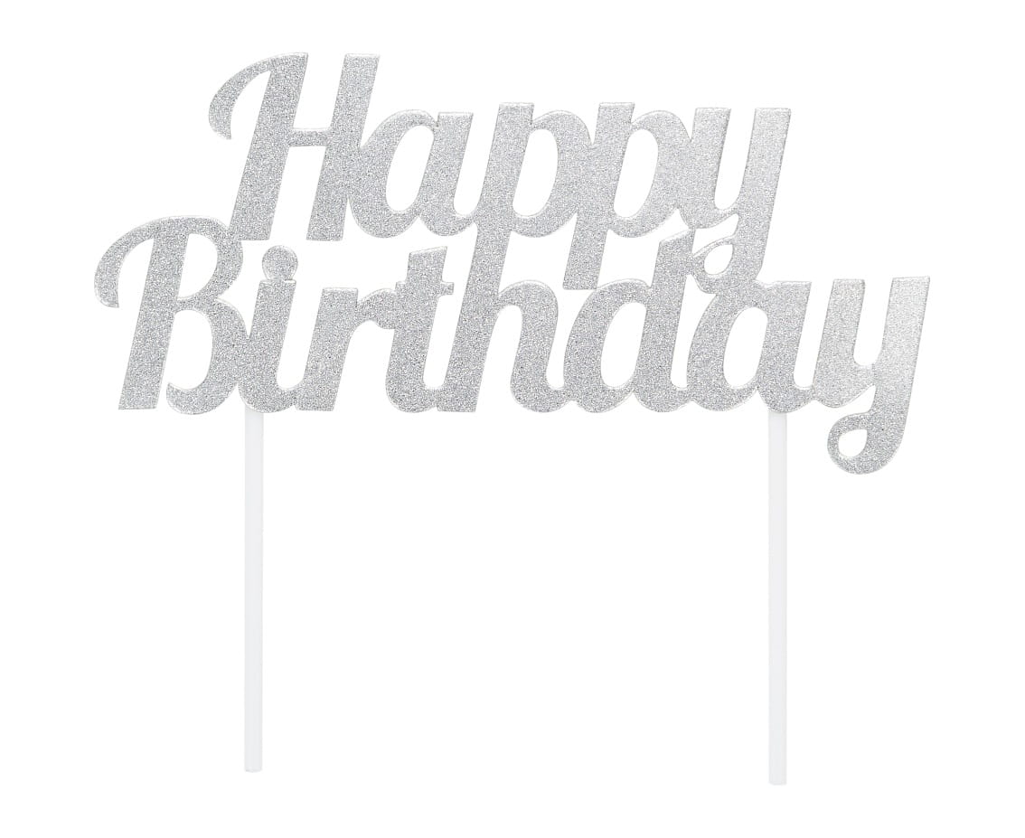 Topper napis "Happy birthday" w kolorze srebrnego brokatu, wielkość: 17,7 x 15,2 cm. Opakowanie zawiera 1 szt.