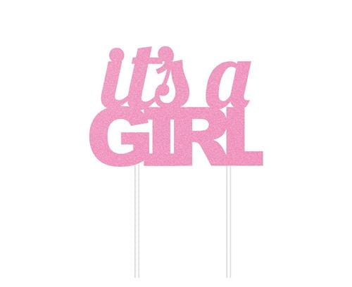 Topper napis "It's a girl" w kolorze różowym brokatowym, wymiary: 20 cm, x 17,7 cm. Opakowanie zawiera 1 szt.