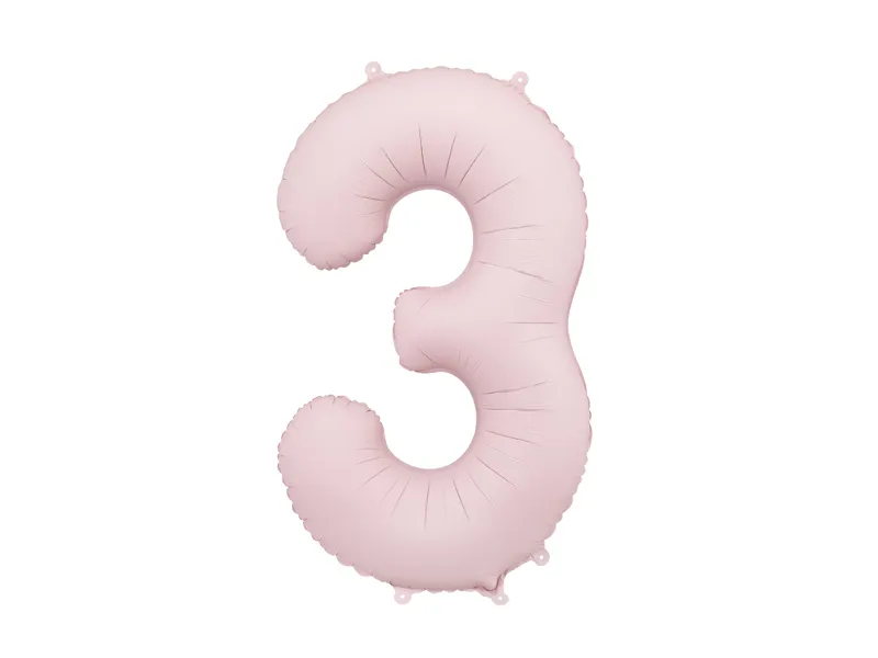 Balon foliowy cyfra 3 w kolorze jasnoróżowym macie, wysokość 86 centymetrów.