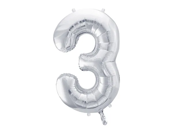 Balon foliowy cyfra 3 w kolorze srebrnym, wysokość 86 centymetrów.