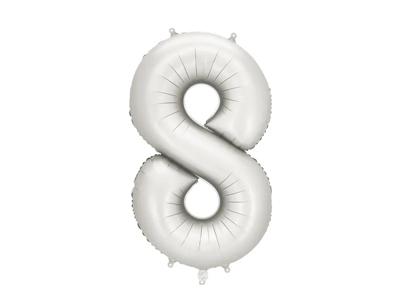Balon foliowy cyfra 8 w kolorze srebrnym matowym, wysokość 86 centymetrów.