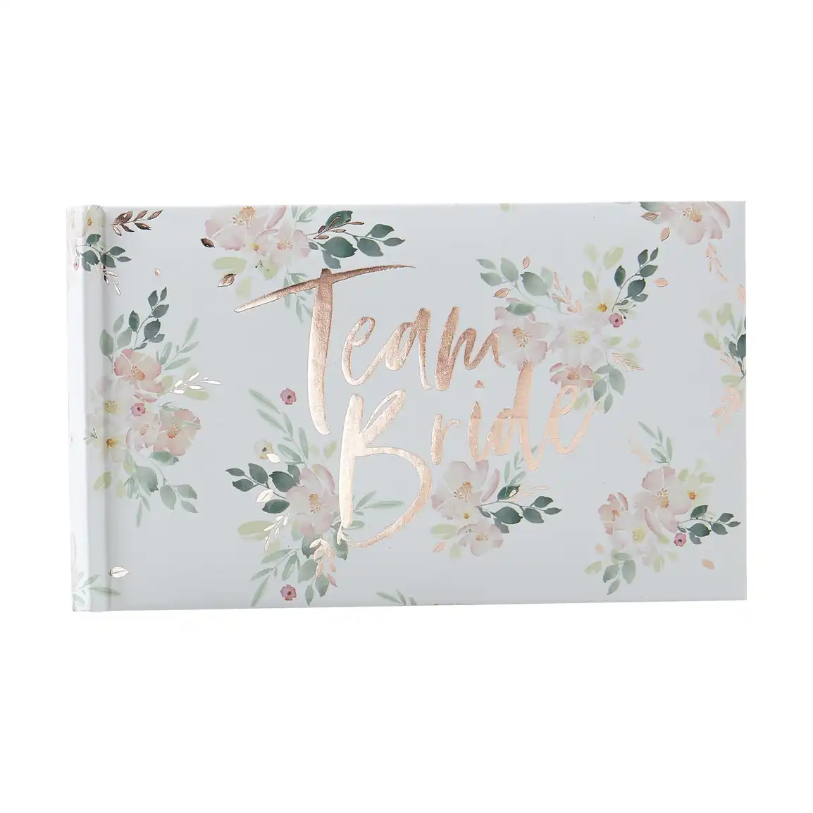 Album ma kwiatowy wzór oraz napis "Team Bride" w kolorze różowego złota.
