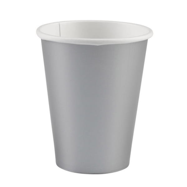 Papierowe kubeczki jednorazowe w kolorze srebrnym, pojemność 270 mililitrów. Pakowanie: 1 opakowanie zawiera 8 sztuk.