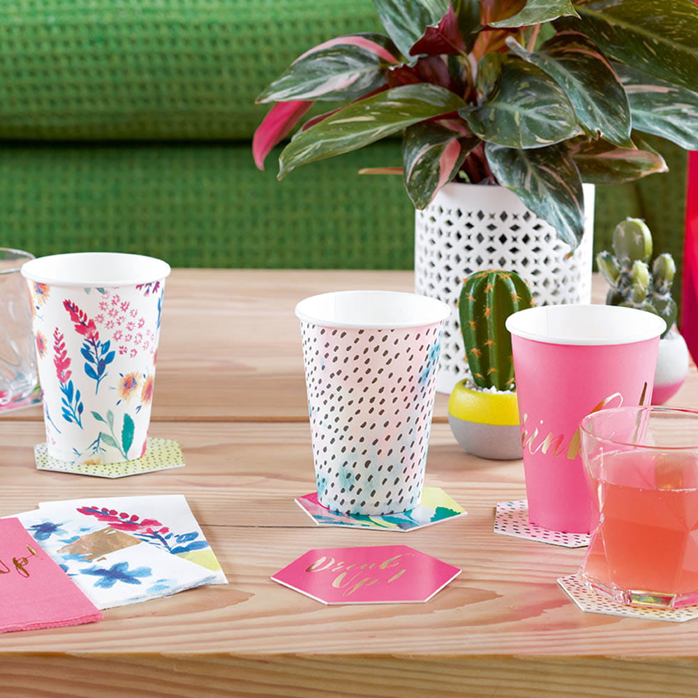 Papierowe kubeczki jednorazowe, wzór kwiaty fluorescencyjne. Pakowanie: 1 opakowanie zawiera 12 sztuk.
