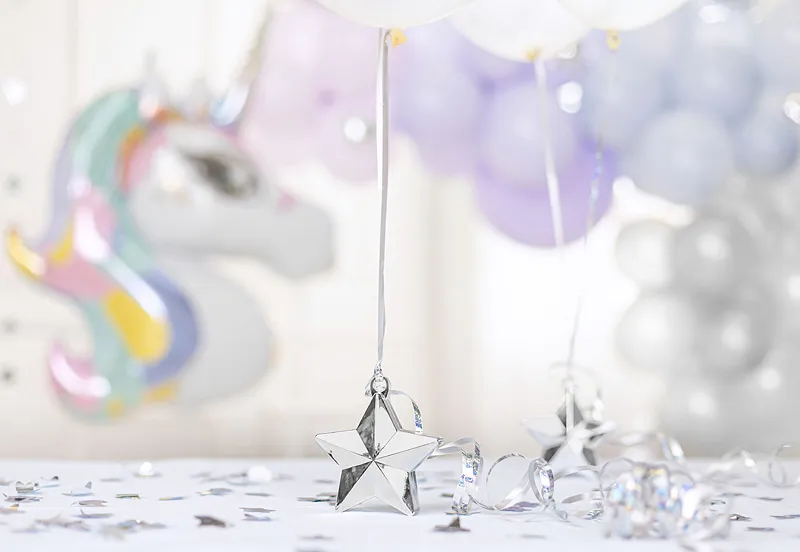 Obciążnik do balonów w kształcie gwiazdki, w kolorze srebrnym. Waga 175g. Ciężarek utrzyma kilkanaście balonów.