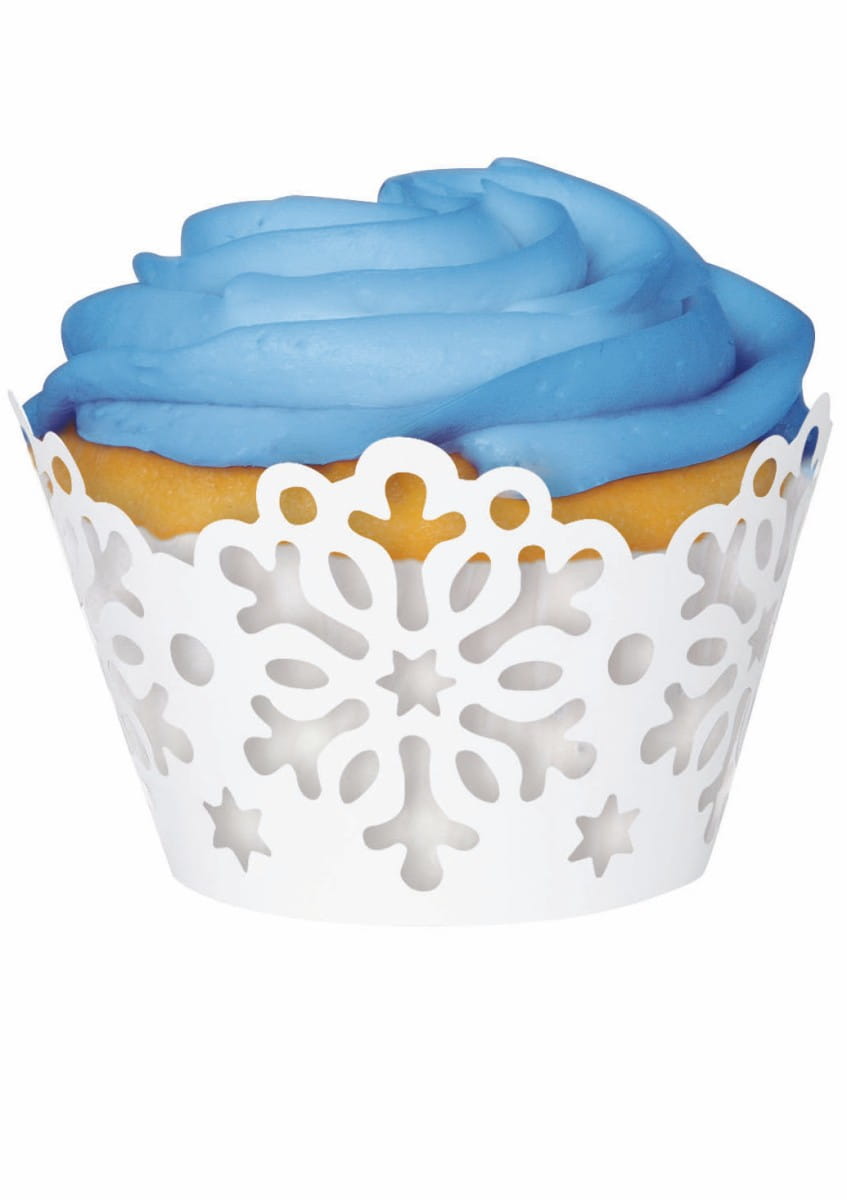 Papilotki na muffinki w kolorze białym, z wyciętym ornamentem w kształcie śnieżynki. Pakowanie: 1 opakowanie zawiera 12 sztuk.