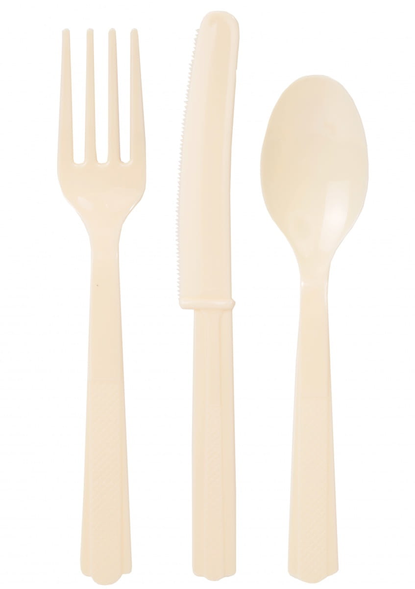 Plastikowe sztućce w kolorze kremowym. Pakowanie: 1 opakowanie zawiera 18 sztuk.
