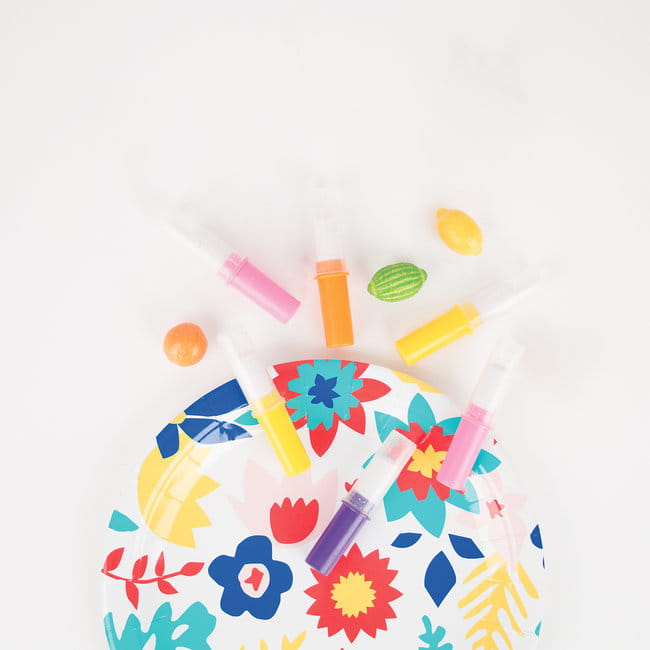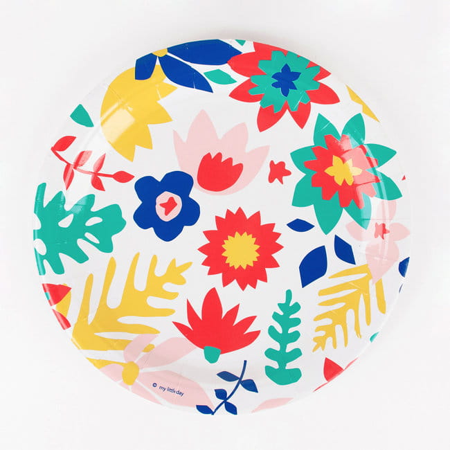 Papierowe talerzyki jednorazowe, wzór tropikalne kwiaty, średnica 23 centymetry. Pakowanie: 1 opakowanie zawiera 8  sztuk.