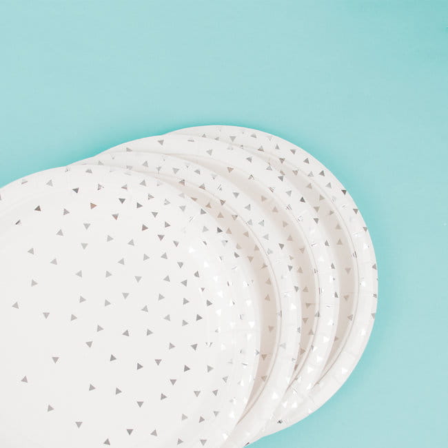 Papierowe talerzyki jednorazowe, wzór srebrne trójkąty, średnica 23 centymetry. Pakowanie: 1 opakowanie zawiera 8 sztuk.